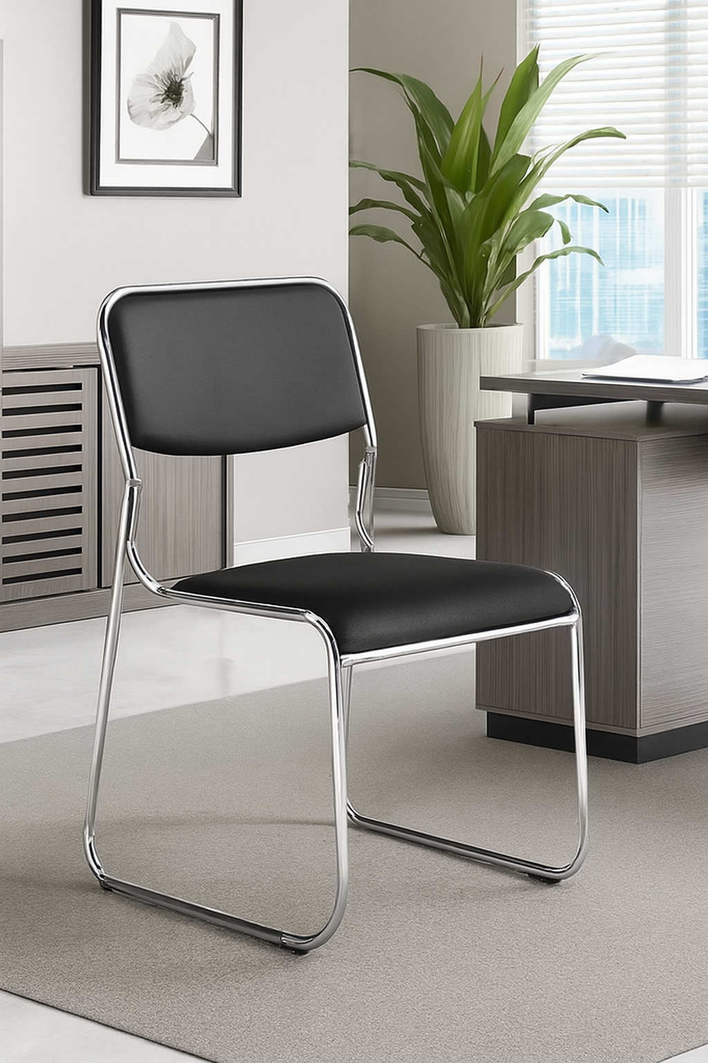 Introduce refined simplicity to your workspace with the Sleek Cantilever Visitor Chair, designed for contemporary offices, reception areas, and stylish home setups. With its chrome metal frame and black padded upholstery, this chair offers a clean silhouette that complements both executive and minimalist environments. Whether you’re outfitting a corporate office, clinic, or creative studio, this chair delivers understated elegance with everyday functionality.