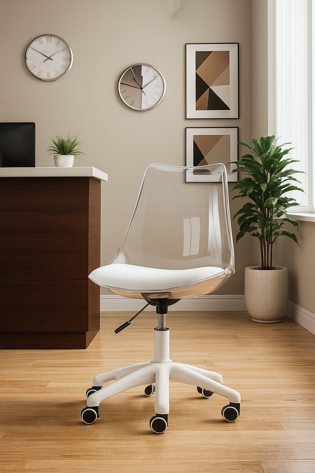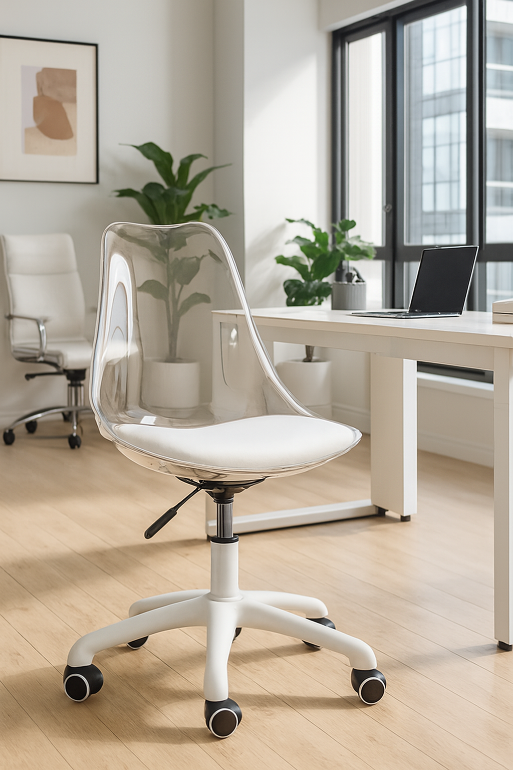 Elevate your workspace with this sleek, modern office chair that blends transparency and clean white tones for a fresh, minimalist look. Ideal for creative studios, executive suites, and home offices. Perfect for professionals who value style, simplicity, and ergonomic support. This chair adds a touch of elegance without overwhelming your space—making it a smart choice for both productivity and design harmony. Where clarity meets comfort.