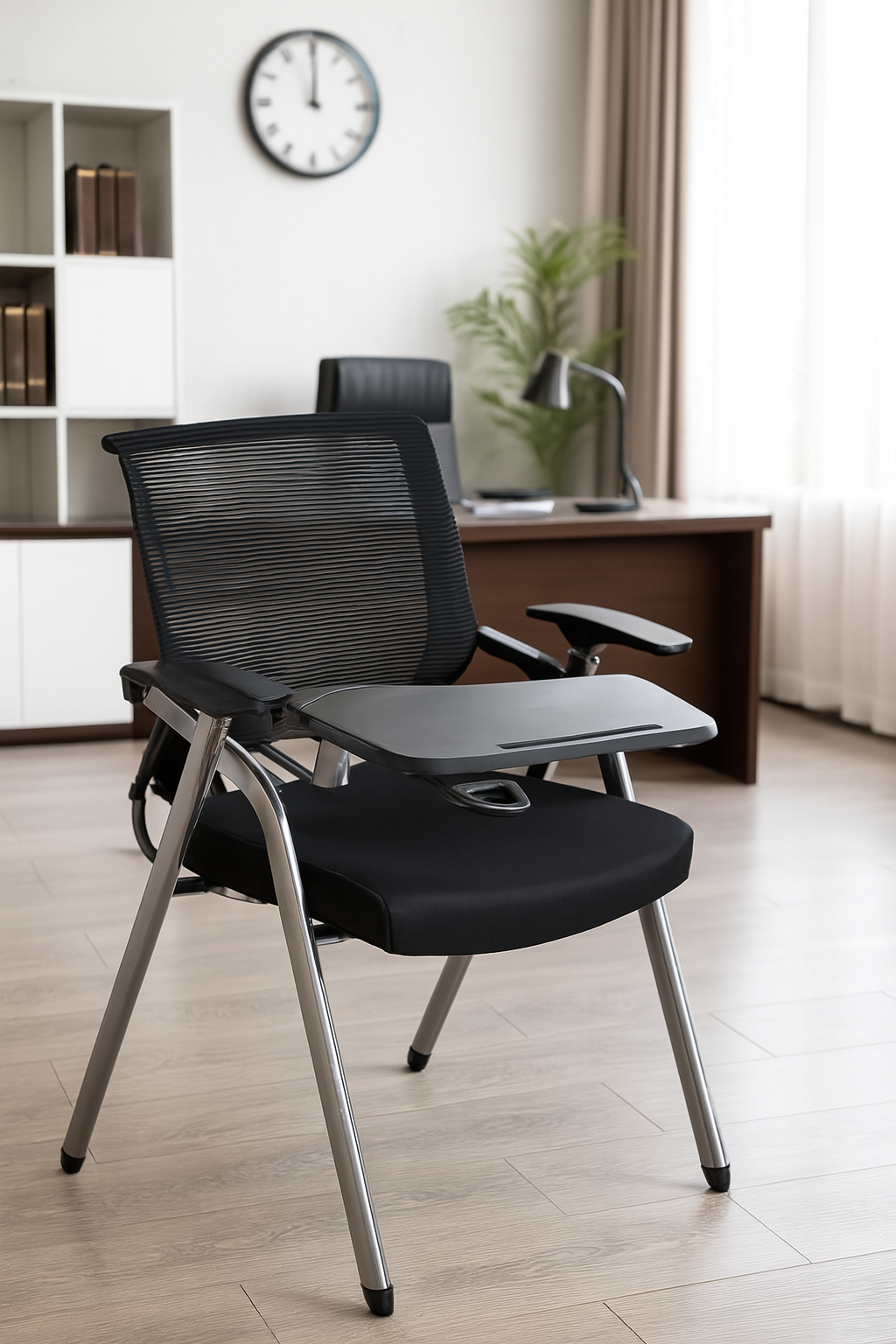 Redefine your classroom, seminar, or training space with this versatile training chair, engineered for comfort, convenience, and productivity. Featuring a breathable mesh back, cushioned seat, and a built-in writing tablet, it’s the ideal solution for compact, functional setups that don’t compromise on style. Perfect for universities, training institutes, conference halls, and corporate workshops, this chair combines sleek design with practical features that enhance focus and engagement.
